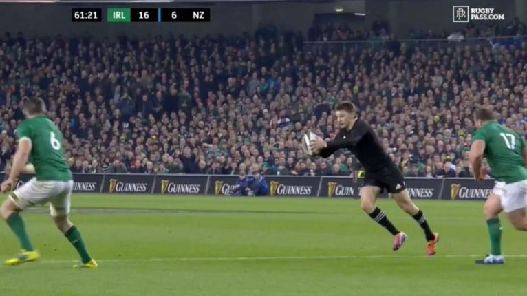 The All Blacks make healthy in-roads down the left-hand side through Jack Goodhue. Earls (14) is forced to make a tackle, and Kearney (15) is downfield out of shot also out of play after making a tackle attempt.