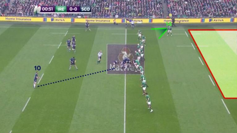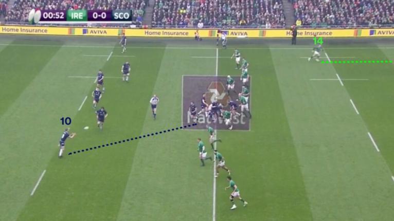 Ireland’s defence, particularly the wingers, predict the play and pre-empt the kick often, so if you are predictable it will be covered. However, the opportunity is there to exploit this tendency and manipulate Ireland.