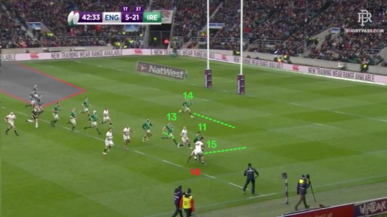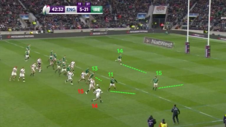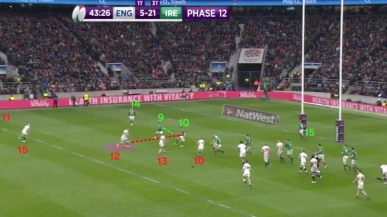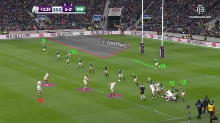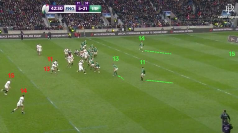 The halves duo of Conor Murray (9) and Johnny Sexton (10) are defending on the edge – not the fastest pair – and would be outgunned by a speedster like Elliot Daly. Ireland are vulnerable to a cross-field kick without their full kick coverage team (Kearney, Earls, and Stockdale), or advantageous match-ups can be found attacking the opposite edge and getting a one-on-one with a slower defender.