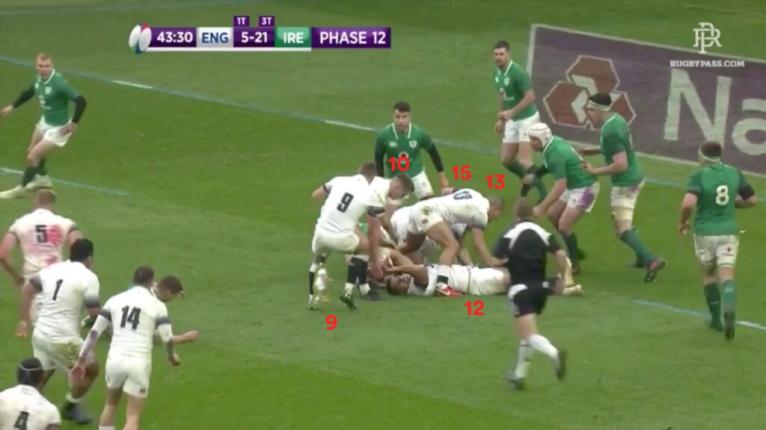 England has made a decent gain but Ireland’s defence didn’t break and most of the numbers are on their feet. This is where England’s rigid play fails to capitalise on the one thing they did achieve – taking out the fullback.
