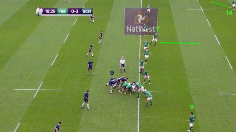 This is a box kick on halfway from the Scotland clash. Greig Laidlaw (9) is selling the kick and Scotland are setup for a box kick, Dan Leavy (7) has turned his back on the attack and is already backtracking, Murray (9) on the short-side is retreating and Earls is already so far back he’s nearly out of shot.