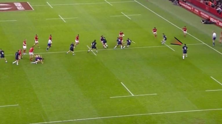 Hastings is so far deep and doesn’t react to the sweep line of George North (14), failing to anticipate the need to be on the other side of the field. Again, Ali Price (9) is not performing in any type of sweeper role. Hastings tries to make it across but is not able to lay a finger on Davies.
