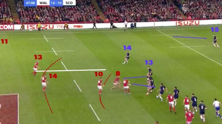 Wales run a screen pass on the left edge with Davies (13) running short and North (14) out the back.