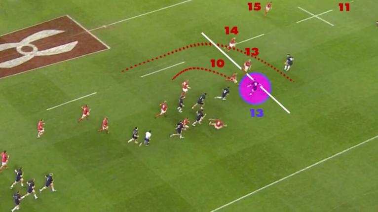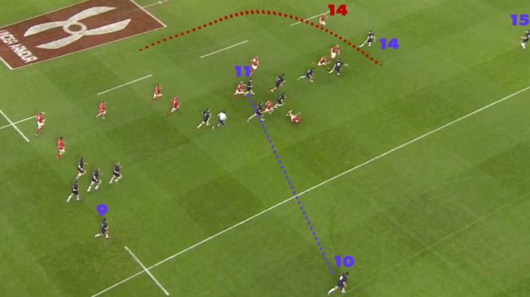Scotland plays with just one man in the backfield, the fullback, expecting him to cover the vast space in behind and the last man on both edges. There is no rolling coverage where the opposite wing (11) drops back and across to help, and the halfback doesn’t track the ball in behind the ruck as a sweeper.