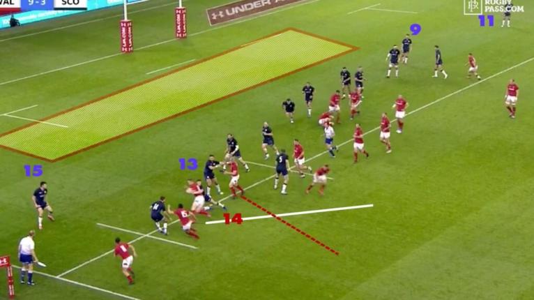 Scotland plays with just one man in the backfield, the fullback, expecting him to cover the vast space in behind and the last man on both edges. There is no rolling coverage where the opposite wing (11) drops back and across to help, and the halfback doesn’t track the ball in behind the ruck as a sweeper.