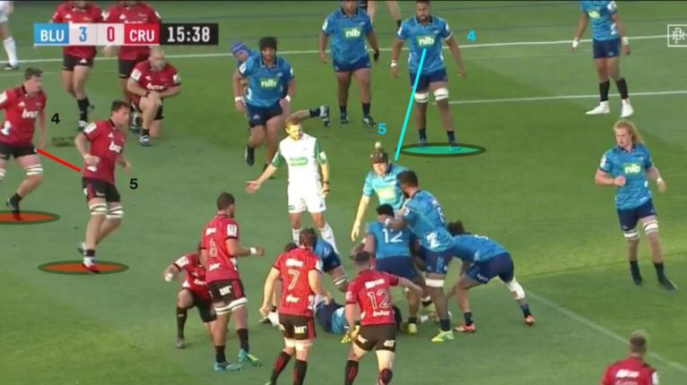 The Blues’ shape in the middle third has changed under Leon Macdonald. They have adopted Tasman’s 5-3 forward split to set up a large open side with a central two-man pod and a midfielder out the back, but this was only visible briefly as there wasn’t much continuity in phase play in this area of the field.