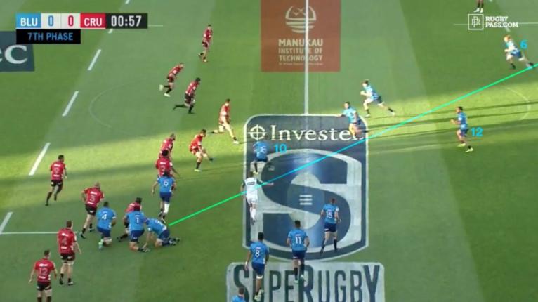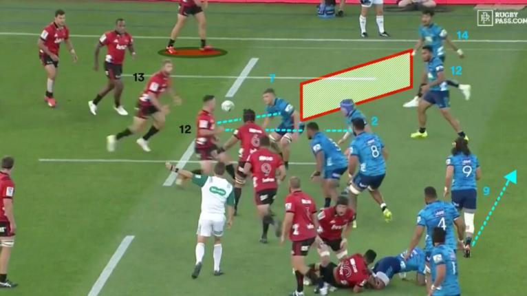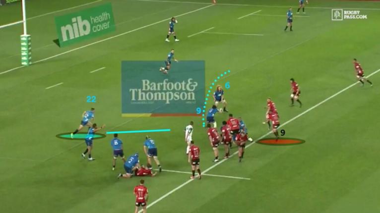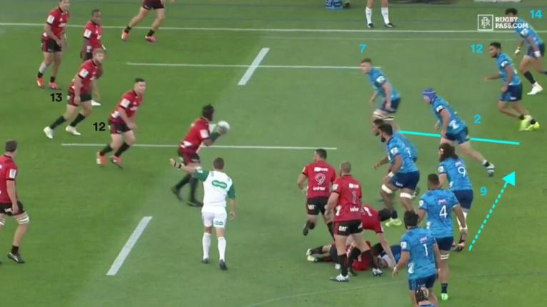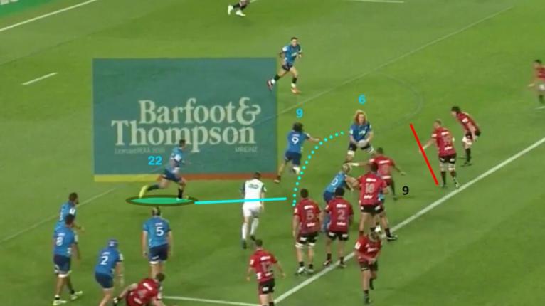 The Blues setup for a clearing kick from Harry Plummer (22), but Ruru (9) feeds Tom Robinson (6) and performs a wrap around, pulling some the Crusaders’ interior defenders wider.
