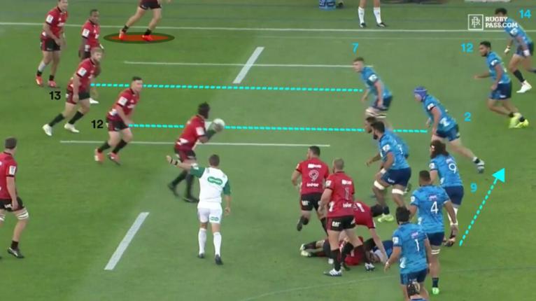 The Blues setup for a clearing kick from Harry Plummer (22), but Ruru (9) feeds Tom Robinson (6) and performs a wrap around, pulling some the Crusaders’ interior defenders wider.