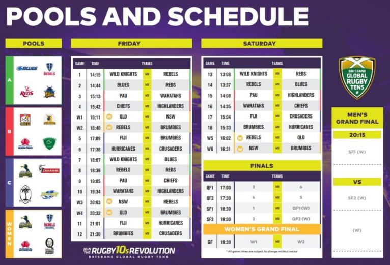 The schedule for the Brisbane Global tens has been released with the competition set to kick off on Friday at 14.15 with the Wild Knights meeting the rebels, followed by a showdown between the Blues and Reds in game two.
