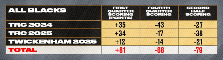 The pattern has been consistent ever since ‘Razor’ Robertson took over as head coach after the 2023 World Cup. The All Blacks are pin-sharp in the first 20 minutes and tend to score heavily in that period, suggesting top-quality game planning and assessment of the opponent’s weaknesses. In the second half, and in the fourth quarter especially, they are a blunt instrument which leaks points at an unprecedented rate for any New Zealand side.