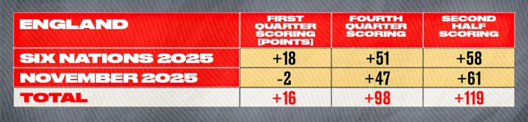 England had lost to New Zealand three times in 2024 by a combined total of 10 points, and they failed to score a point after the hour mark in all of them. On Saturday, they made sure there was no repeat, winning the second half by a margin of 14 points and the last 20 by eight. That is progress for you folks, and you can view it in the following table.