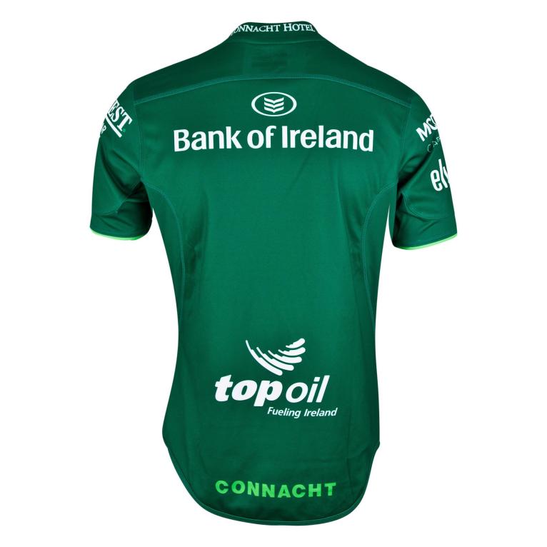 According to Connacht: “This year’s jersey maintains its traditional Connacht green look and feel with the introduction of horizontal tonal green and fluro lines, and with fluro piping detailing inspired by the “Grassroots to Green Shirts” vision of Connacht Rugby. The jersey also features a unique silicon gel logo application and fluro green Connacht branding on the lower back.