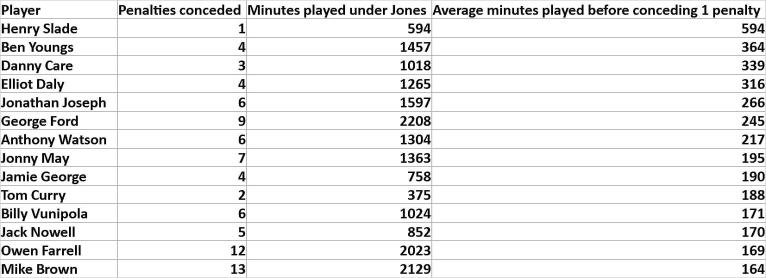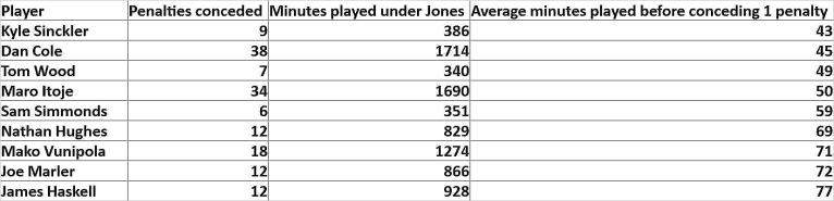 We can see that Maro Itoje has played a massive 1690 minutes under Jones conceding a total of 34 penalties in that time. That is 1 penalty just about every 50 minutes played.