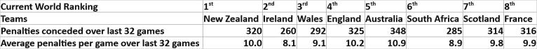 Ireland have conceded the least amount of penalties and have the best average of about 8 penalties conceded per game over the same 32 game period. Roughly speaking England, New Zealand, Scotland and France have conceded 10 penalties a game.