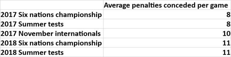 If anything they just made it harder for themselves to win those championships with such poor discipline. In the image below, you can even see a trend of increasing indiscipline from the 2017 6 Nations to the 2018 summer tests.