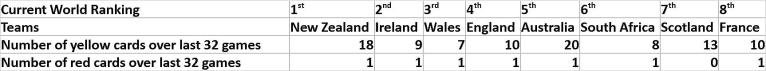 As for the number of yellow cards, England find themselves tied with France for the 4th most yellow cards given out to the top 8 teams. There seems to be nothing unusual about England’s discipline in terms of yellow or red cards when compared with the other 7 nations.