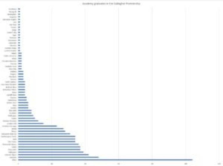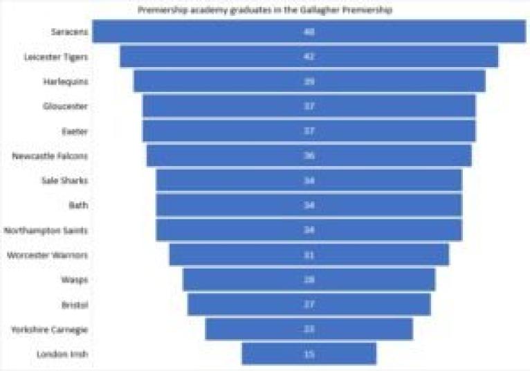 If we remove the ‘Others’, majority of Championship clubs and the foreign sides, leaving the 12 current Premiership sides and London Irish and Yorkshire Carnegie, who together make up the 14 clubs which run full academy programs and have protected recruited grounds, we get a clearer idea of the most productive academies in the competition.