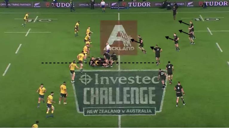 The Kiwis seem to be in a cycle of change that probably started after the Lions rattled them with big linespeed two years ago. So what we see them doing now, amongst other things, is using attack shapes that try to fight the rush by first splitting the defence. The aim is to set up a ruck in the middle of the field that gives them two sides to attack, with Barrett and Mo’unga as playmakers. This can take the sting out of the rush because defenders have to first fold around the ruck. They can also end up numbers down if they fold incorrectly. Also, with two wide zones to defend on either side of the ruck defenders can become more hesitant. And finally, presented with two options on attack the All Blacks can choose to overload one side to establish an advantage.