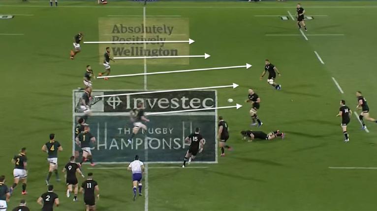 Taking all this into account, my feeling is that we are seeing a tentative reinvention of the All Blacks style. The rise of offensive defence is probably one big reason, but it could also be that the All Blacks are looking at how much ball teams kick away in modern rugby and that they want to feed off that possession. Kicking less as well as interesting player selections lead me to believe this. The choice of Beauden Barrett at 15 is notable because there is probably no player in the world better fitted for orchestrating counter-attack. He has the tactical awareness to identify space, the speed to take play to where that weakness is, and the skill to bring his team mates into play.