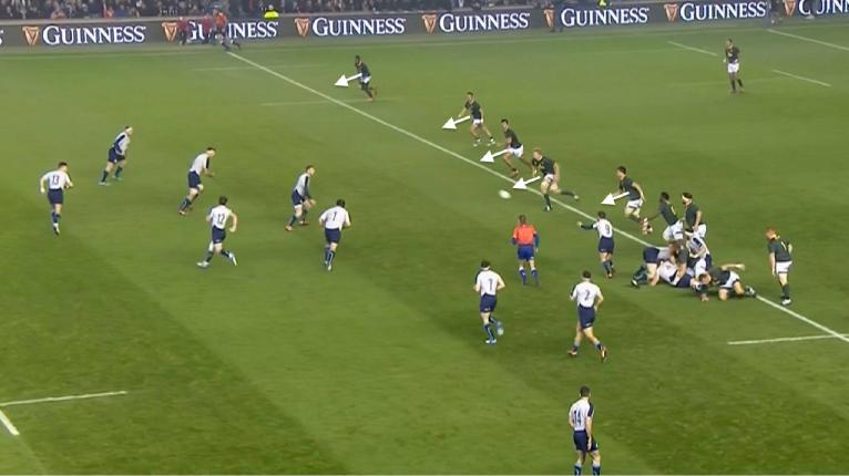 Firstly, they do not really make “reads”. They do not wait to make a decision about what to do, they just GO. It is not really a “situation-dependant” system. Because they do not wait to make a read, they win a crucial second to get that much closer to the opposition the moment the ball come out of the ruck. And believe me a defender can cover a lot of ground in one second.