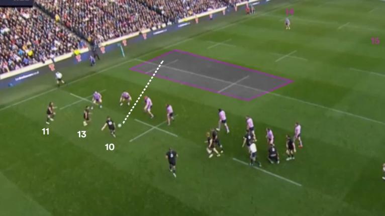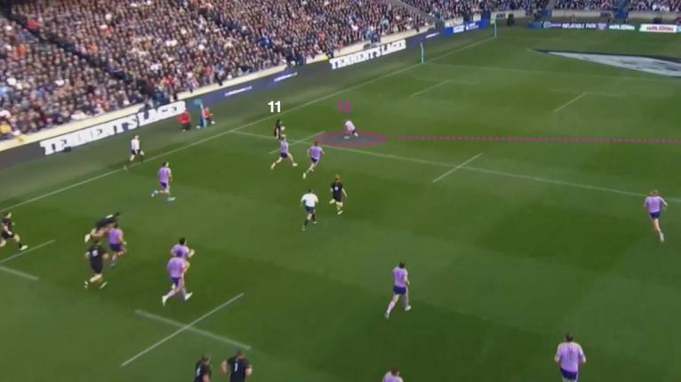 He was able to commit Darcy Graham and put Caleb Clarke (11) away down the sideline, which further weakened Scotland’s backfield when Stuart Hogg (15) had to cover Clarke.