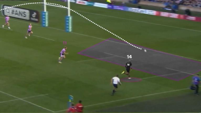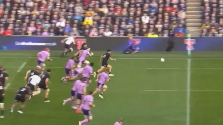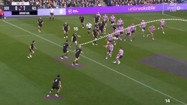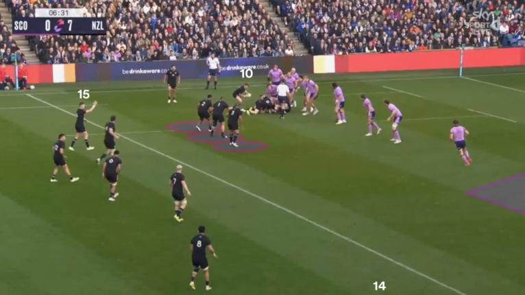 With no active sweeper scanning for short kicks in behind, this was a vulnerability in the Scottish defence the All Blacks would have prepared to target.