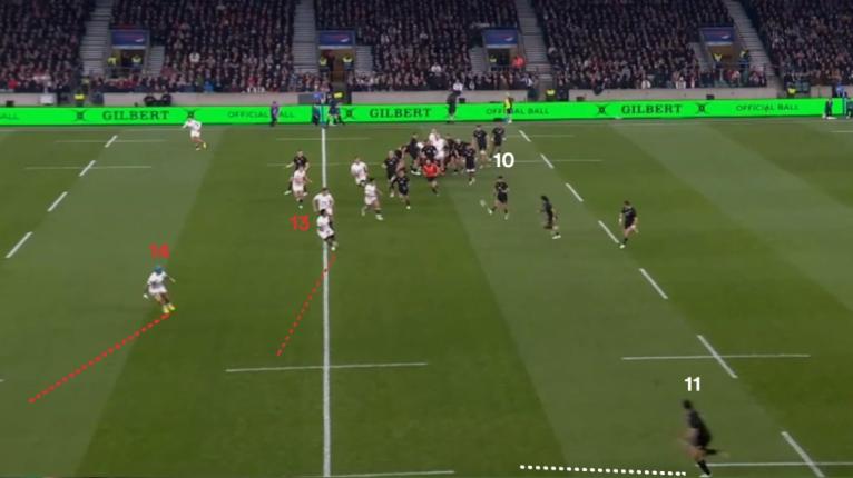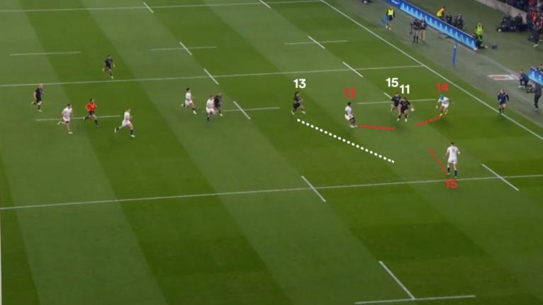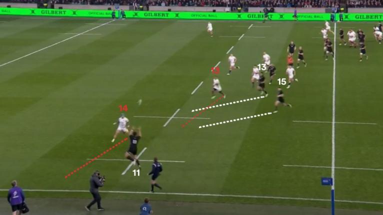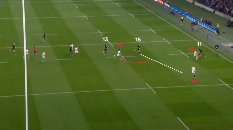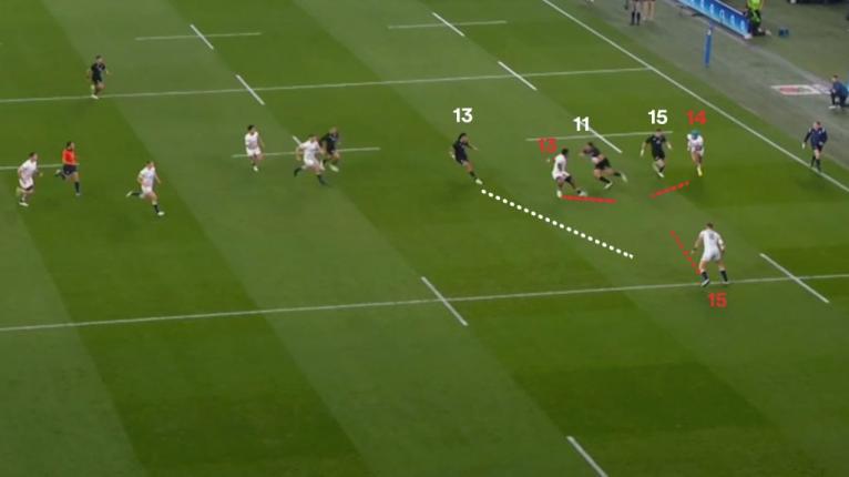 The left winger pulled in Mo’unga’s kick with an acrobatic leap, and although Jack Nowell (14) covered the space, England were stretched quickly with a lagging disconnection forming between Nowell and Manu Tuilagi (13).