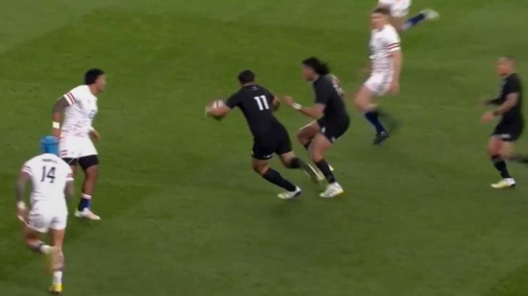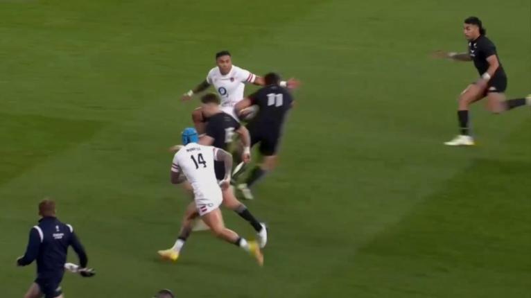 Clarke opting to beat another defender killed the momentum of Rieko Ioane (13) and allowed the next inside defender, Owen Farrell, to catch up from the inside.