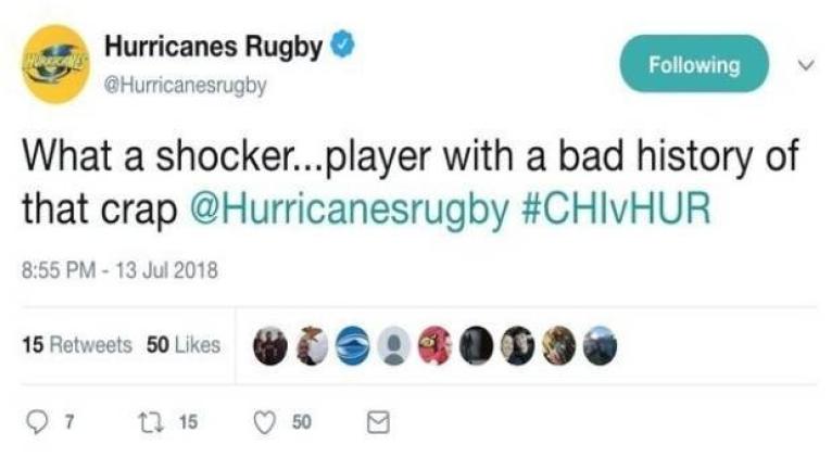 Following the incident the Hurricanes tweeted “what a shocker… player with a bad history of that crap” while the TMO reviewed Fa’auli’s tackle. The tweet was later deleted, and a statement was issued to Stuff stating the club “regret a social media post that was made on the club’s official Twitter account during Friday night’s match against the Chiefs at FMG Waikato Stadium following an incident that saw a red card issued to Johnny Fa’auli for a dangerous tackle.”