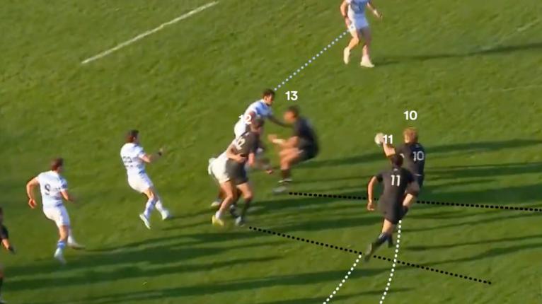 The outside centre angles in as a short option outside 12, with the No 10 and blindside winger floating around the edge to overload the far side.