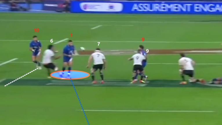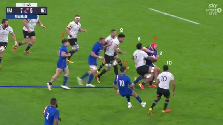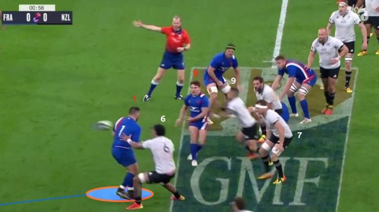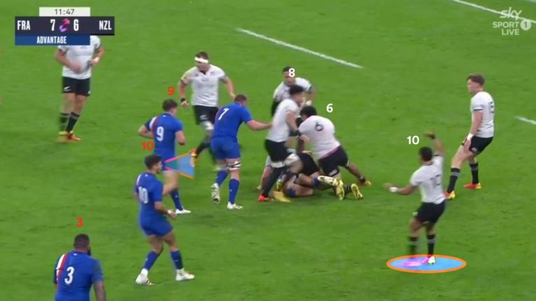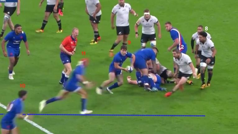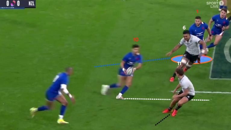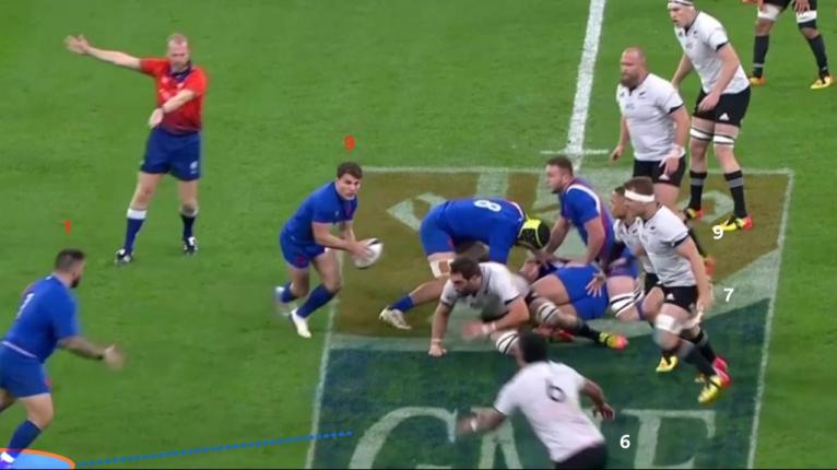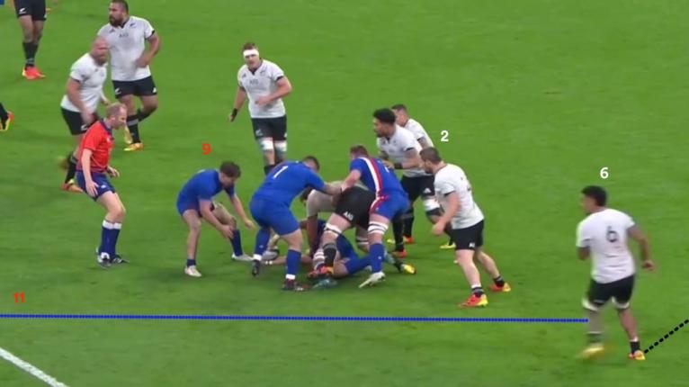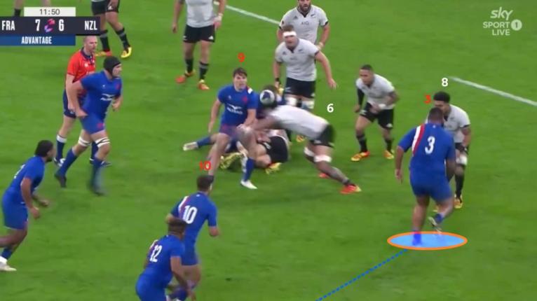 France used one lead runner, Cyril Baille (1), to hold the ruck defence. His line also drew a bad read from Akira Ioane (6) who closed in from the outside.