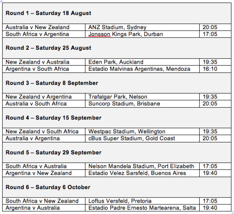 SANZAAR have confirmed the 12-match schedule for this year’s Rugby Championship including match venues and kick-off times.