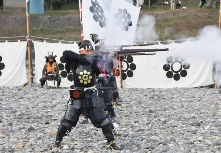 Gunners dressed in traditional armour give an impressive performance using weapons from the Edo period (1603-1868) .