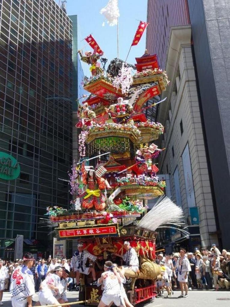 Originally, men carried 15 metre high Yamakasa floats and paraded slowly down the streets of the town. However, due to the risk of getting stuck on electric cables and lights installed during the Meiji Era (1868-1912), it was decided that they were more suitable for display purposes only and called Kazariyama (tall decorated floats). Shorter floats to be carried were then made, called Kakiyamakasa.