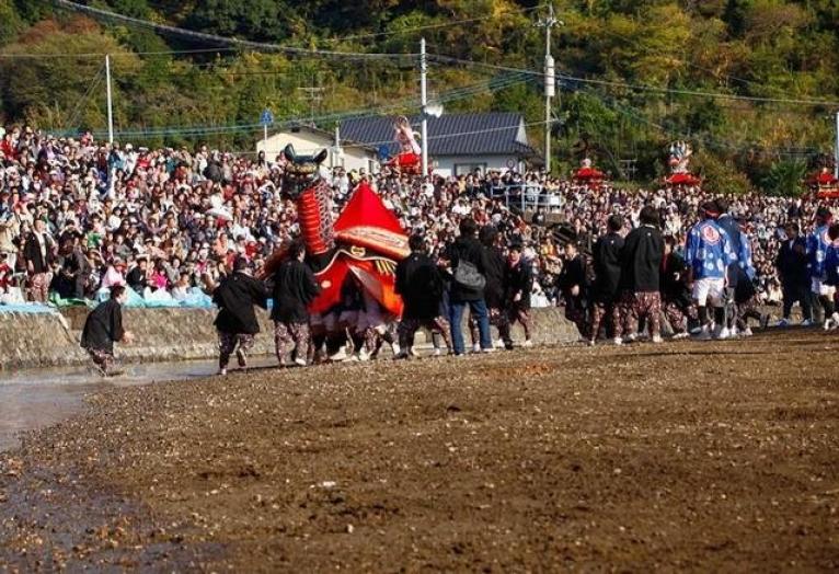 Historical background: Proper hikiyama floats have been built in the Mameda and Kuma districts since 1714, and the ones we see today have been built since the late Meiji period (1868-1912). Gion-bayashi, the traditional music played in the parade, was created in 1817 by Tokutaro Koyama, a detective in the local administration.