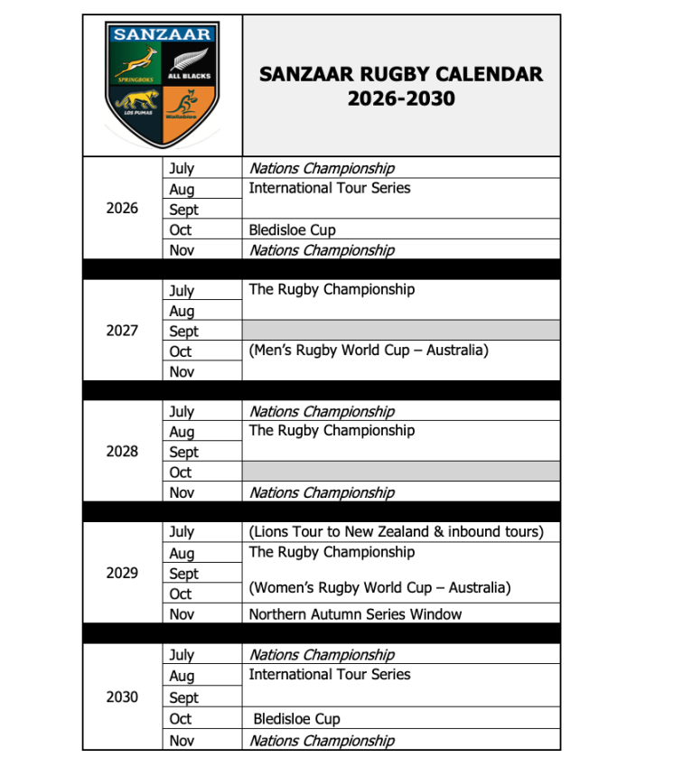 In 2026 and 2030 when TRC doesn’t take place, international multi-week tours will be played in the August-September window, which is a new concept in SANZAAR’s calendar. This schedule also includes the proposed Nations Championship in 2026, 2028 and 2030.
