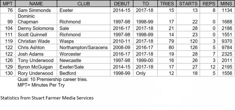 Chris Ashton has the most tries in the top ten with 80 from 126 games and sits sixth on the list with a score every 122 minutes, the same as Josh Adams and ahead of Tony Underwood, Byron McGuigan and Rory Underwood.
