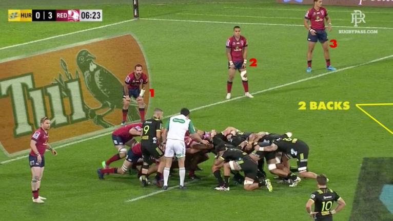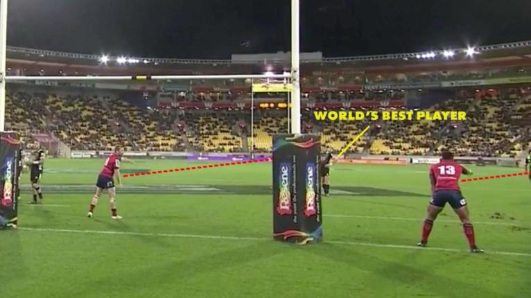 By stacking three defenders on the blind side to cover two backs, the Reds defensive setup guarantees that Beauden Barrett will get the ball. The Hurricanes have been given a 4-on-3 overlap to the open side with BEN LAM, the best finisher in Super Rugby, left open unmarked.