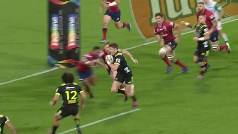 The Reds manage to hold up debutant Peter Umaga-Jensen over the line on the first scrum move, giving the Hurricanes another midfield scrum.