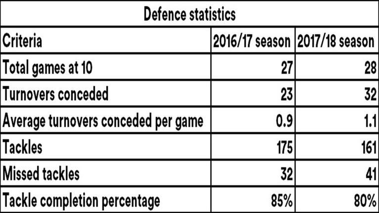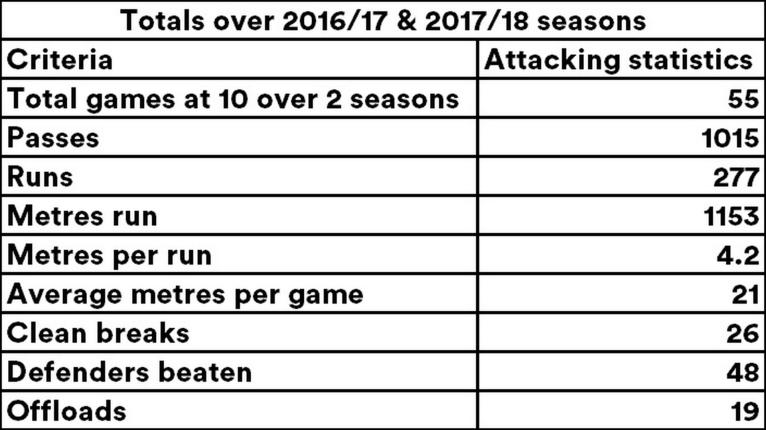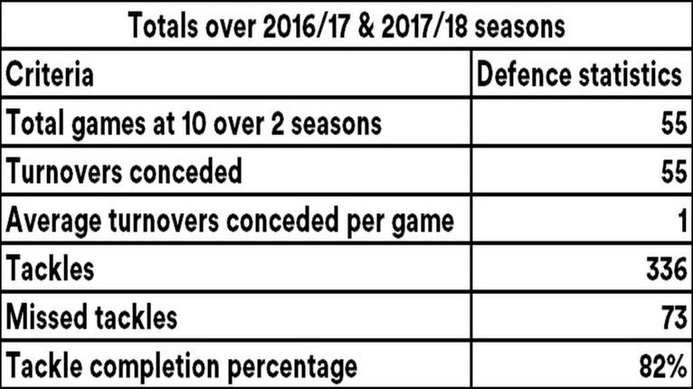 Burns has underperformed in terms of defence this season giving away 9 more turnovers with 32 conceded last season. His tackle success rate also decreased from the 2016/17 season to the 2017/18 season going from 85% to 80% respectively.