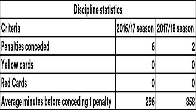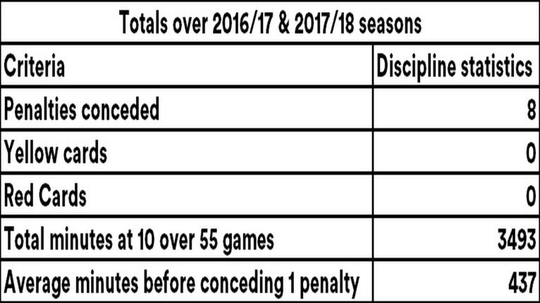 Discipline is another area of strength for the youngster with only 8 penalties given away over 3493 minutes which gives us about 1 penalty conceded every 437 minutes.