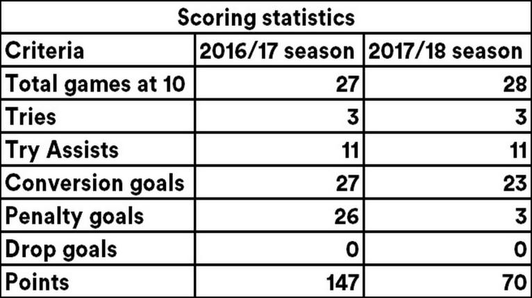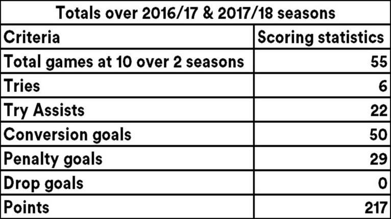 Below we can see his overall scoring statistics covering 55 games at 10 over the last two seasons. What jumps out here is the number of conversions, penalties scored and the number of tries he has assisted in.