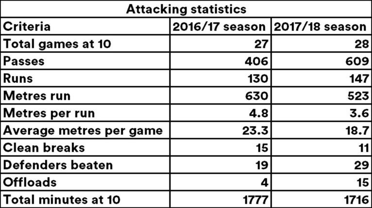 His metres per run performance decreased from 4.8m to 3.6m for the 2017/18 season. The number of clean breaks dropped by 4 but there was an increase in the number of defenders beaten by 10. He tripled the amount of offloads he made last season from the 2016/17 season.