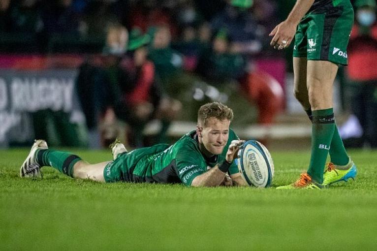 GALWAY, IRELAND: November 26: Kieran Marmion #9 of Connacht holds the ball in the wind for Jack Carty #10 of Connacht to kick a penalty during the Connacht V Ospreys, United Rugby Championship match at The Sportsground on November 26th, 2021 in Galway, Ireland. (Photo by Tim Clayton/Corbis via Getty Images)