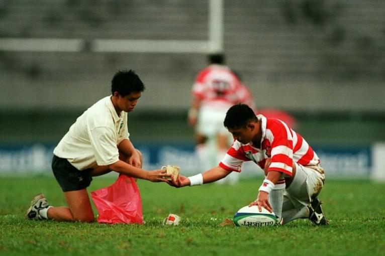 Japan’s Keiji Hirose (right) builds a mound from sand, to kick a conversion (Photo by Tom Honan/EMPICS via Getty Images)