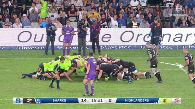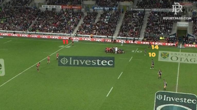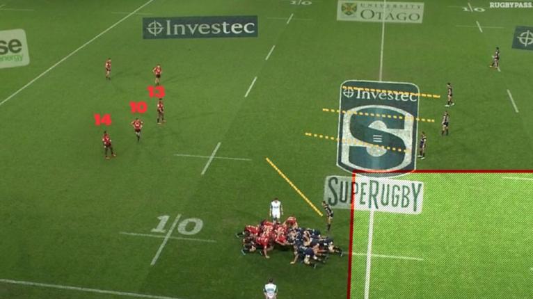 Before this play, the Highlanders had both Lima Sopoaga (10) behind the scrum and Waisake Naholo (14) on the touchline, drawing the attention of George Bridge (11) in that corridor, which won’t work for this trick play.