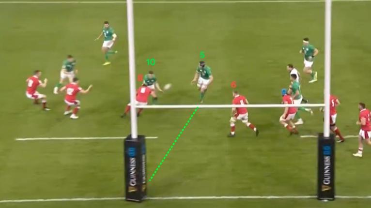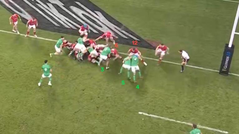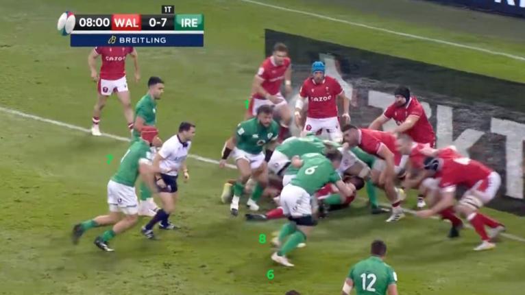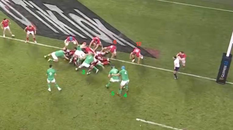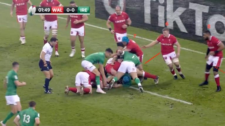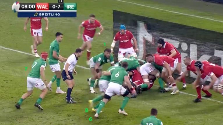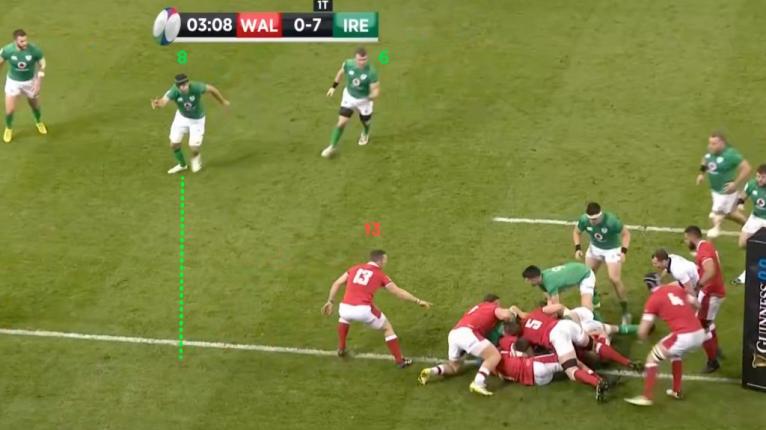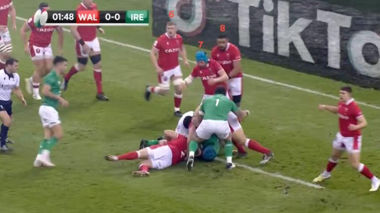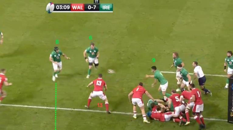 Following a peel play with hooker Dan Sheehan running into the 10 channel, quick carries by the Irish pack began to create a lag between Taulupe Faletau (8) and Jac Morgan (6) coming around the corner.