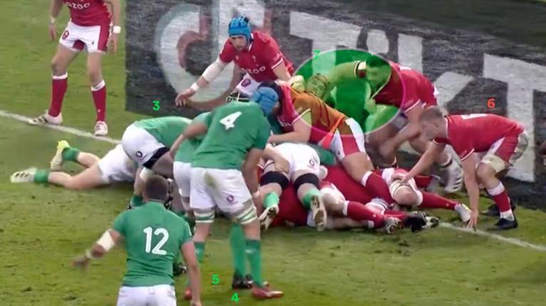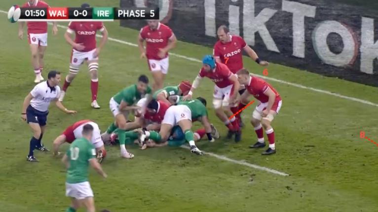 This slight gap became a serious issue for the defence as Ryan’s strong carry drew five Welsh defenders to the ground.
