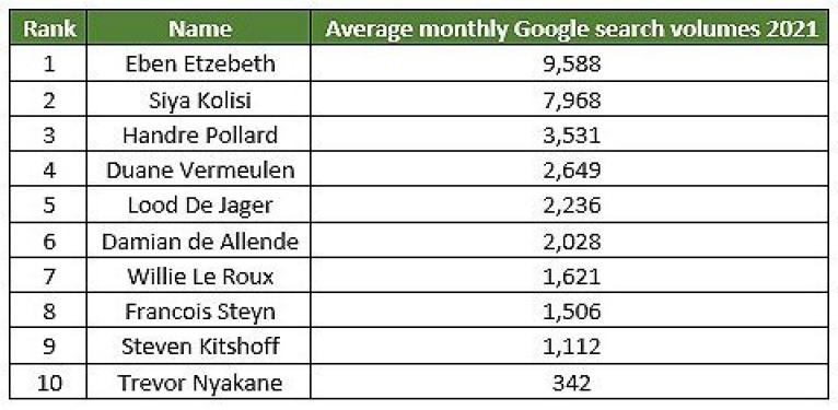 In third with, 3,531 average monthly searches, is flyhalf Handre Pollard – the highest-paid rugby player on the planet.