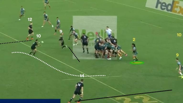 The multi-phase patterns that track back down the short side are a perfect tool to find that mismatch where Gibson-Park can be isolated against powerful ball runners like Akira Ioane or Ardie Savea floating out wide.